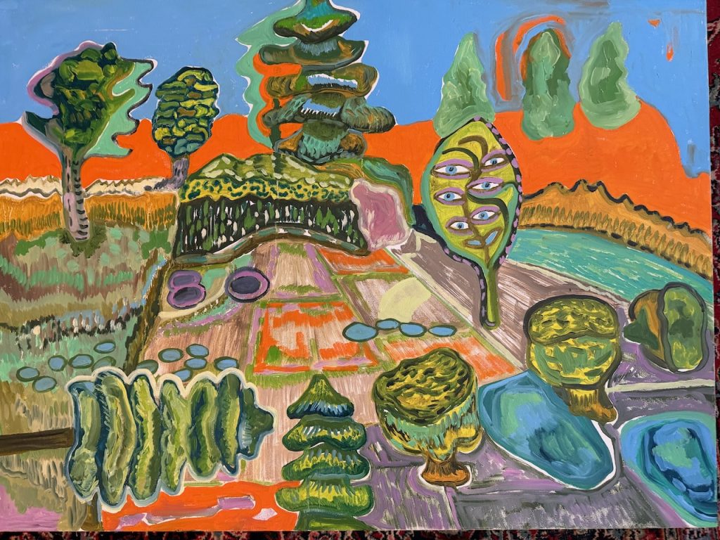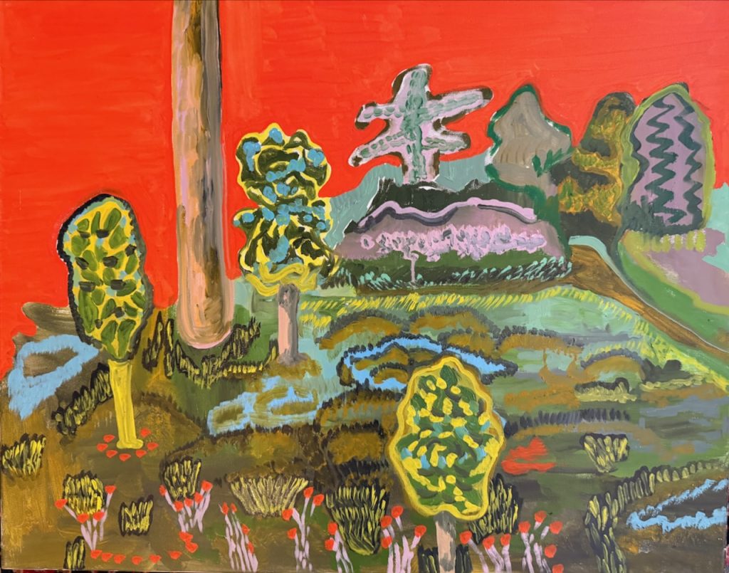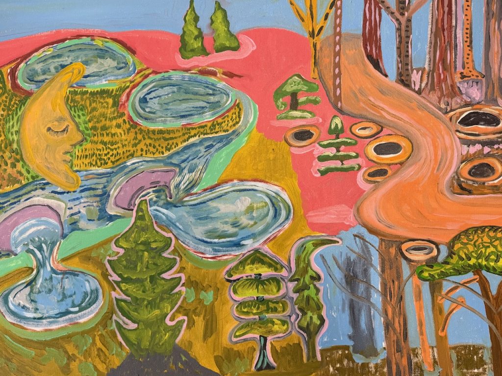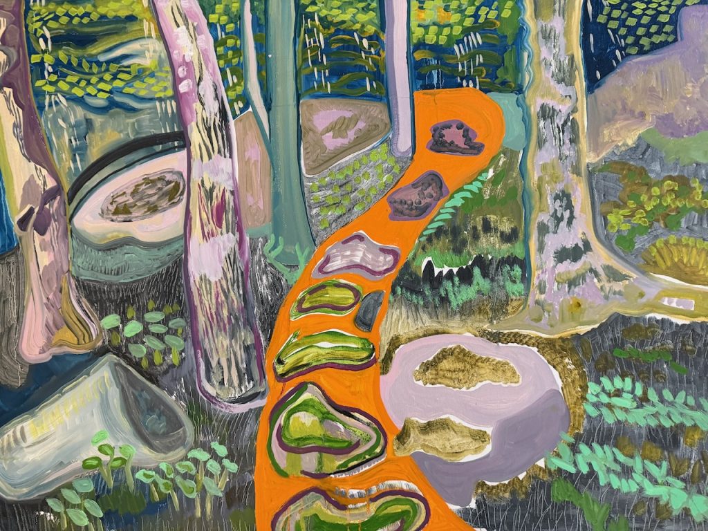 Butler specializes in sifting landscape imagery through his imagination, resulting in boldly colored scenes of undulating lines and patterns. Photographs taken during walks in rural upstate New York serve as the foundation for the subsequent manipulation of form and color found in his work. He states that as he “…dips toes into fantasy realms, reality is never a safety net, but just the bottom of the creative swimming pool. I take the viewer and myself floating to the surface, as I seek not only to show the surface beauty of the natural world, but also its timeless and bold nature. To stop, breathe, and reflect on the mystery of nature is to reinvigorate our intent and reflect personal restoration.”