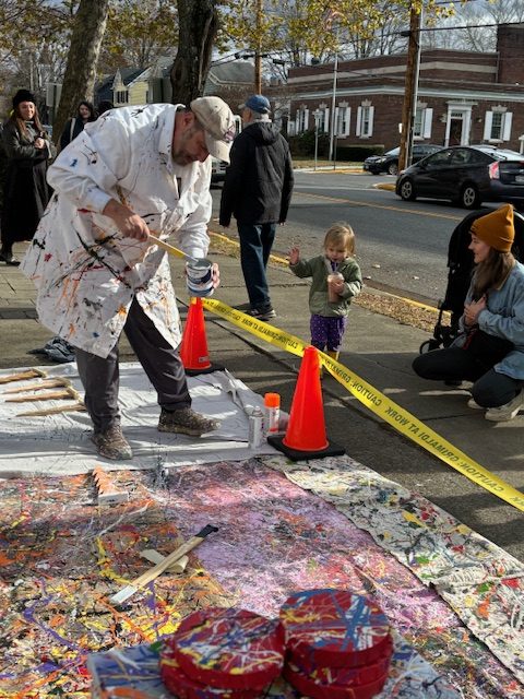as he paints in the style of Jackson Pollock.